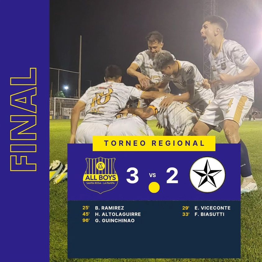 All Boys de Santa Rosa logró anoche un triunfo tan agónico como clave en la Zona 1 de la Región Bonaerense Pampeana Sur del Torneo Regional de fútbol, porque venció 3 a 2 como local a Racing Club de Eduardo Castex y se consolidó como único líder del grupo, con dos festejos en dos presentaciones. Créditos: Diario La Arena