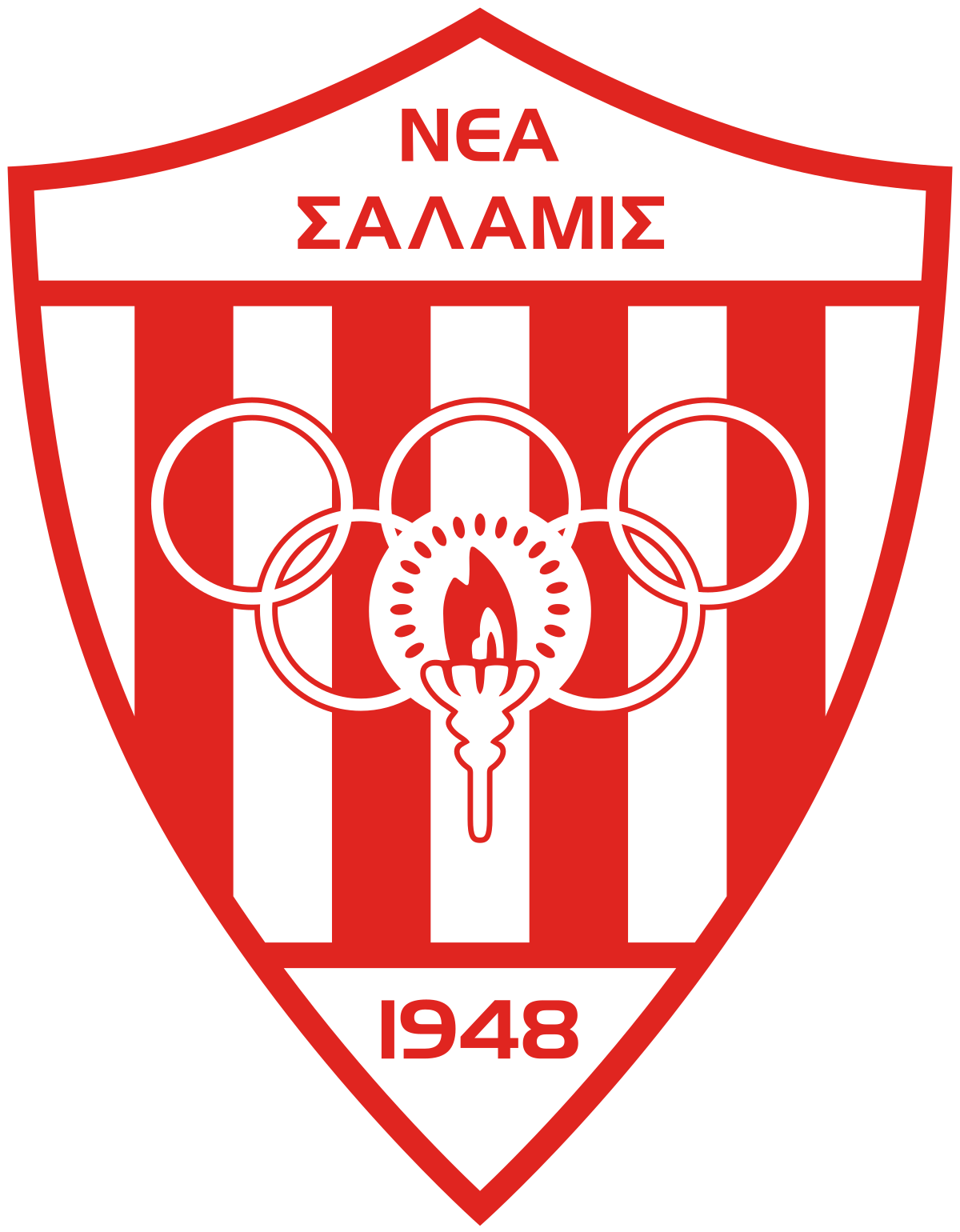 El emblema del Nea Salamina incorpora la llama olímpica, el color rojo y los cinco anillos de los Juegos olímpicos.[29] Los colores del club durante sus dos primeros años fueron el amarillo y el carmesí,[29][30] cuando formó parte de la KEPO. Después de 1950, el Consejo de Gobierno cambió sus colores a rojo y a blanco:[29][30] rojo, que simboliza el poder, y blanco, que simboliza la paz. Las camisetas de rayas rojas y blancas fueron elegidas debido a las que usaba (y usa) el Olympiakos Piraeus.[29]